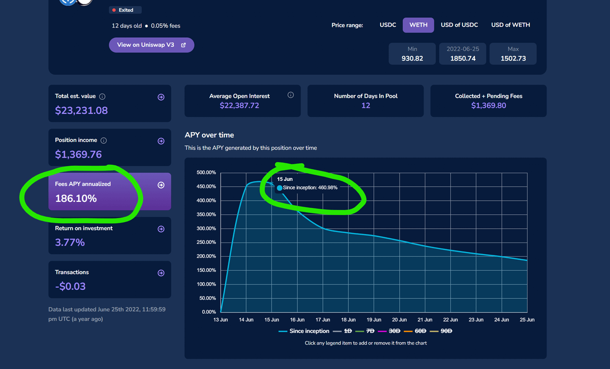$ETH $USDC pool. Range 930-1503. - Avg yield over 12 days - 186% APR - Highest earning yield in a day - 461% APR - Today? Lucky to see 40% with this range.