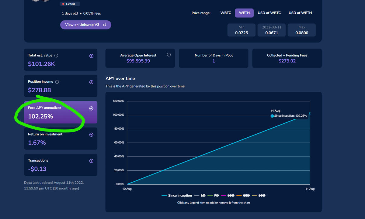 $BTC $ETH pool. Range 0.0725-0.08 BTC per ETH. - Yield earned in one day - 102% APR