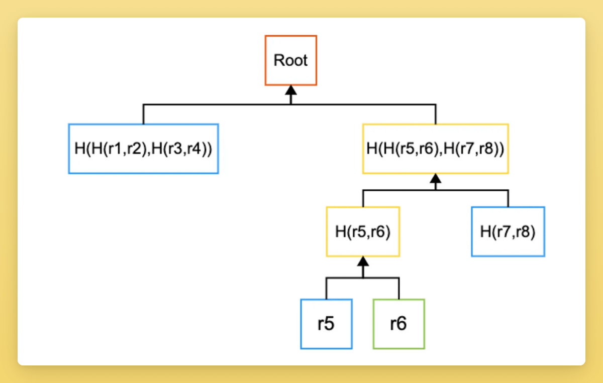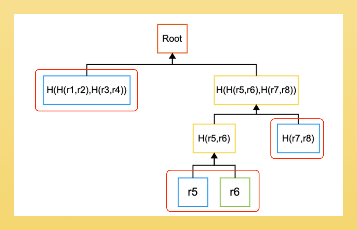 Use r6 example again, we only need to provide r6, r5, H(r7,r8), and H(H(r1,r2),H(r3,r4)) to verify the merkle root, without revealing their actual content.