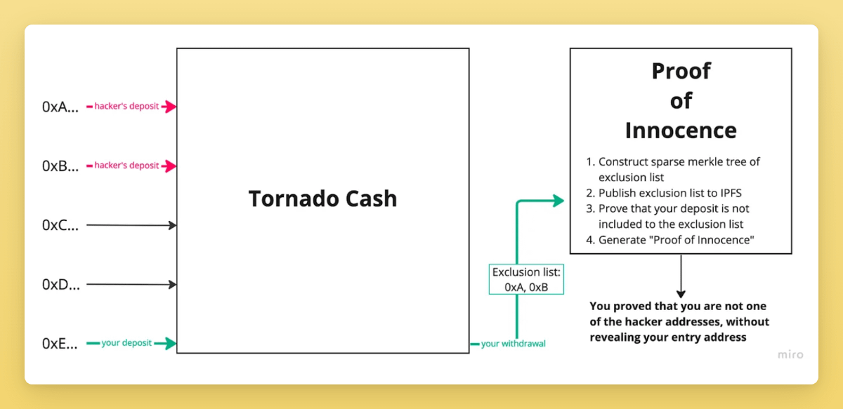 Privacy-Pools introduce the concept of "Proof-of-Innocence”. A withdrawal receipt from the pool can prove the funds come from the allowance list.