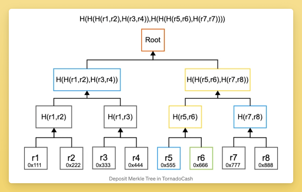 In Tornado, this commitment is added as a leaf at position r6 in the Merkle Tree.