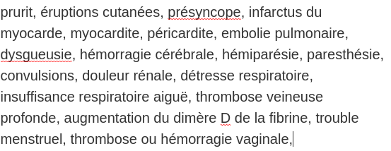 6/n "...la dyspnée, l'arrêt respiratoire, l'embolie pulmonaire, l'infarctus du myocarde, la thrombose, les hémorragies cérébrales et la pneumonie étant les effets indésirables les plus fréquemment mentionnés dans les rapports de décès."