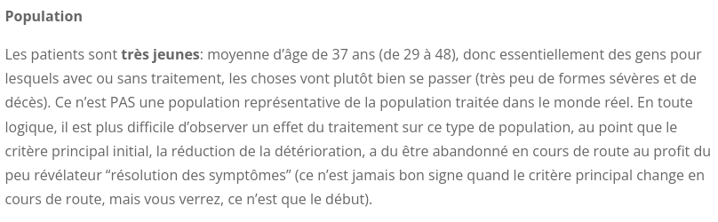 16/n Le mieux est donc d'éviter les critères objectifs comme la charge virale ou la mortalité, mais de choisir des critères subjectifs où la sensibilité des cliniciens payés pour conduire l'essai jouera un rôle déterminant, comme "disparition des symptômes après 21 jours" (Lopez)
