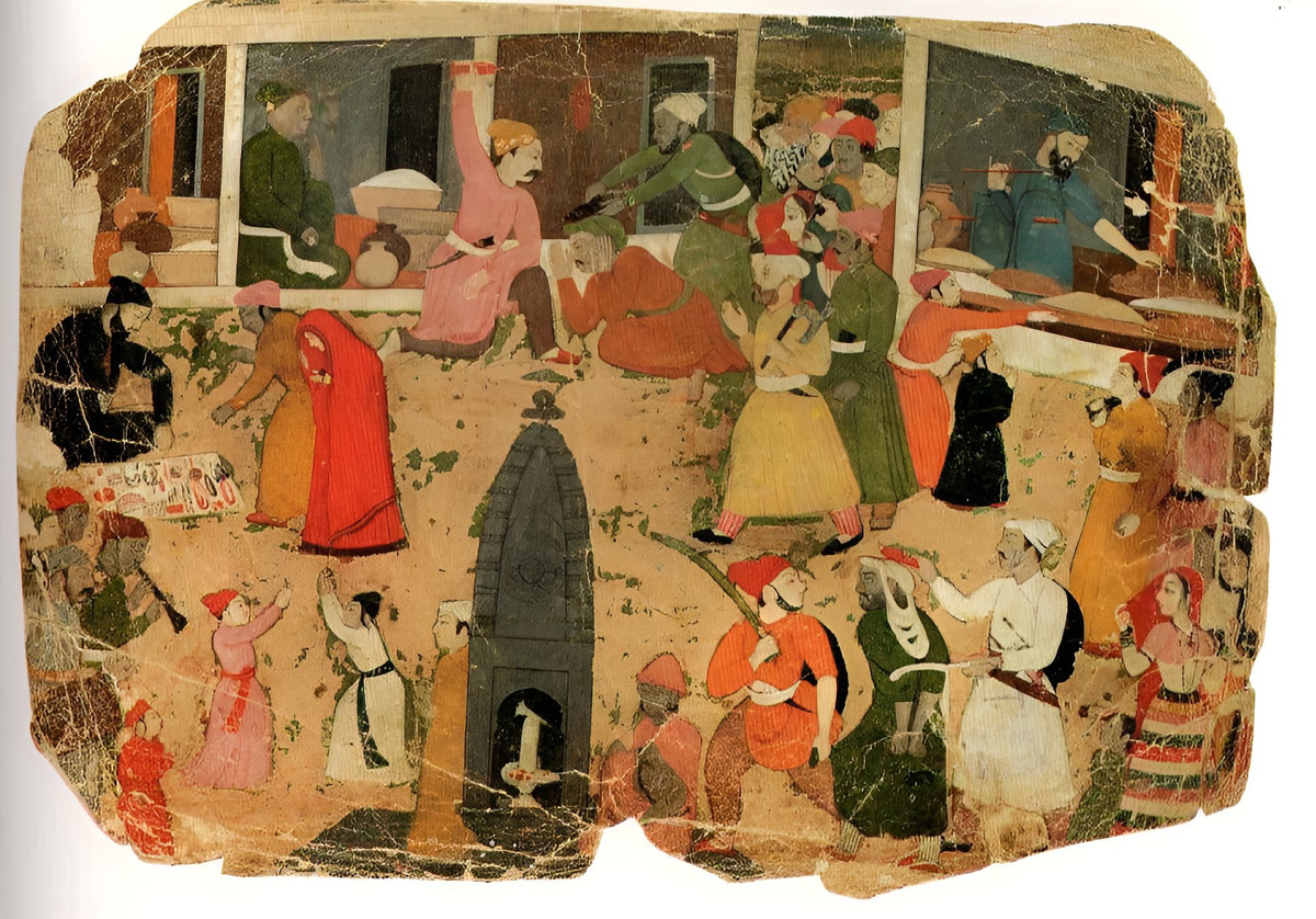 Though damaged, this lively scene reflects the style of Nainsukh, a prominent artist of the Punjab Hill courts.
