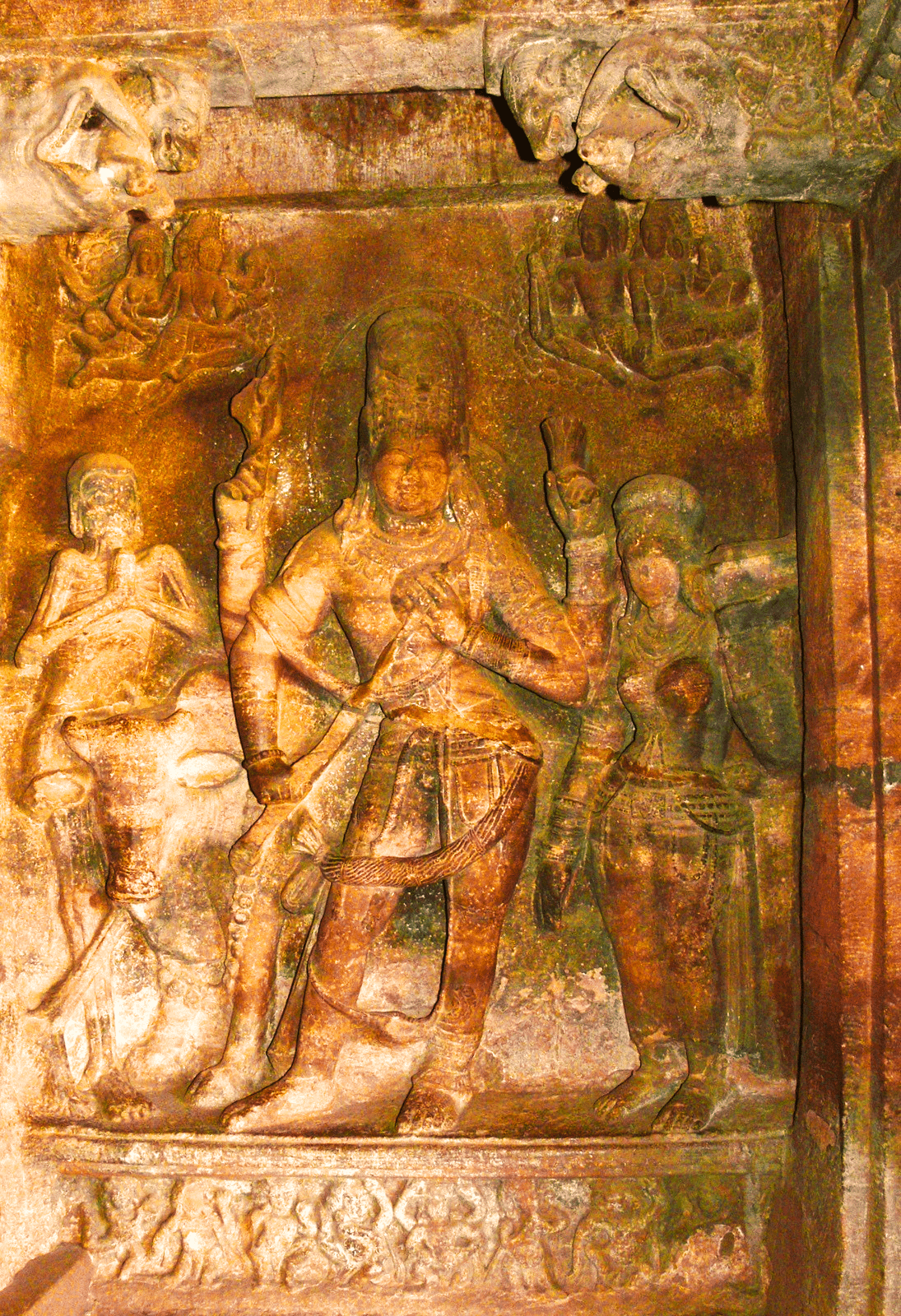 Ardhnareshwar surrounded by Bhringi and a female attendant or Parvati BADAMI