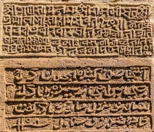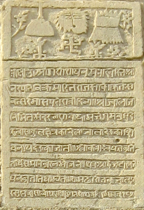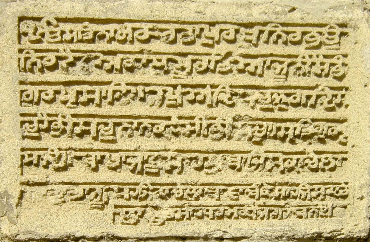 An inscription from the Baku Atashgah. The first line begins: I salute Lord Ganesha (श्री गणेशाय नमः) venerating Hindu God Ganesha, the second venerates the holy fire (जवालाजी, Jwala Ji) and dates the inscription to Samvat 1802 (संवत १८०२, or 1745-46 CE).