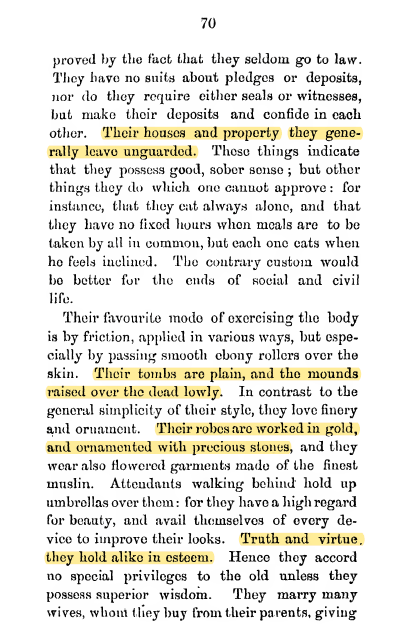 The public at large was honest, disciplined, No-theft, No Written Law. The ๐ก๐จ๐ฎ๐ฌ๐๐ฌ ๐ฐ๐๐ซ๐ ๐ง๐จ๐ญ ๐ฅ๐จ๐๐ค๐๐. Truth and virtue they hold alike in esteem.