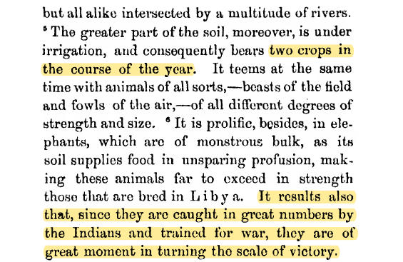 As per Mega., Indian produced Gold, Silver, Copper, Iron, Tin, in huge quantity to make Ornaments as well as armaments. The farming output was mainly rice, millets, bosporum, cereals. India never saw femine as per him. He noted that India had mฬฒuฬฒlฬฒtฬฒiฬฒ ฬฒcฬฒrฬฒoฬฒpฬฒ in an year