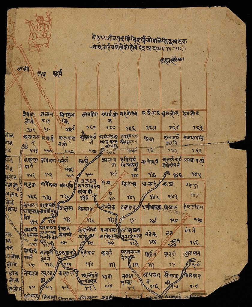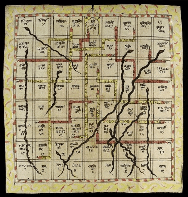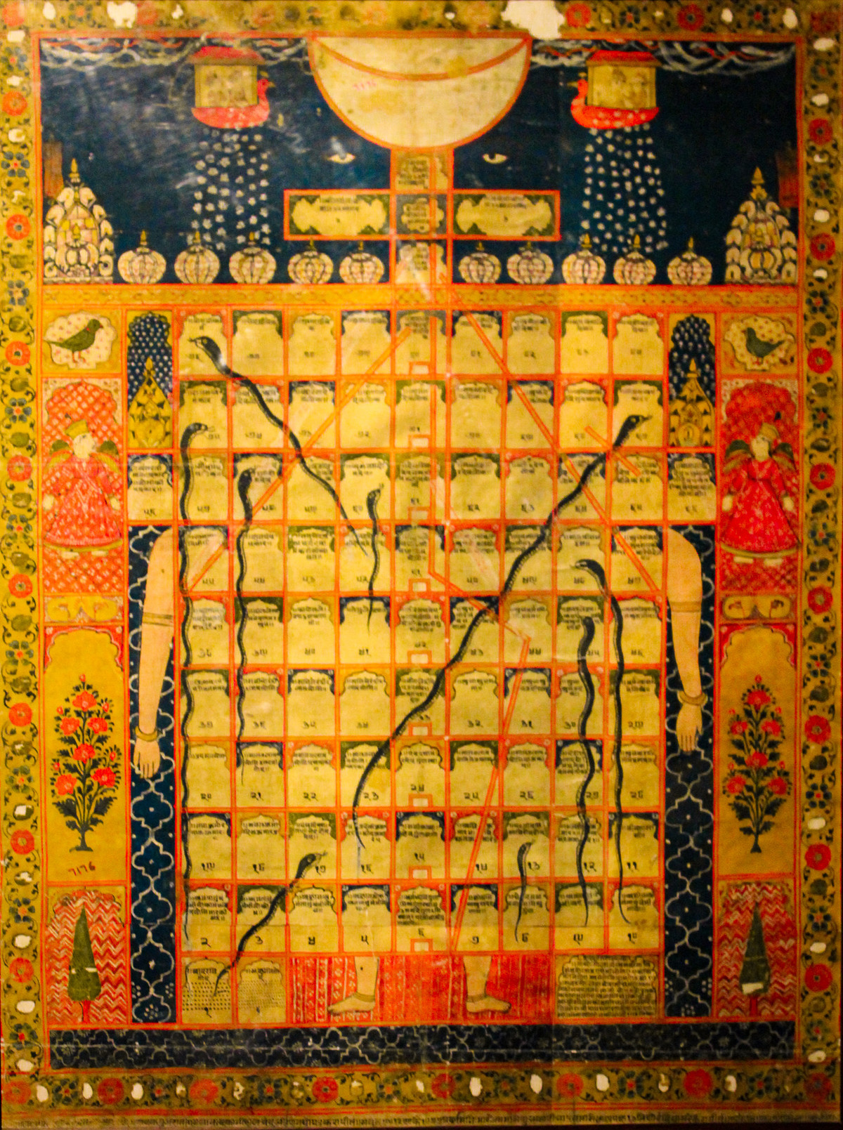 Believed to be developed by Marathi saint, Dnyaneshwar, in the 13th century, this board game served as a tool for teaching karmic theory to younger pupils of Jainism. Each square reflected a moral action, celestial location leading to cosmic journey across the board.