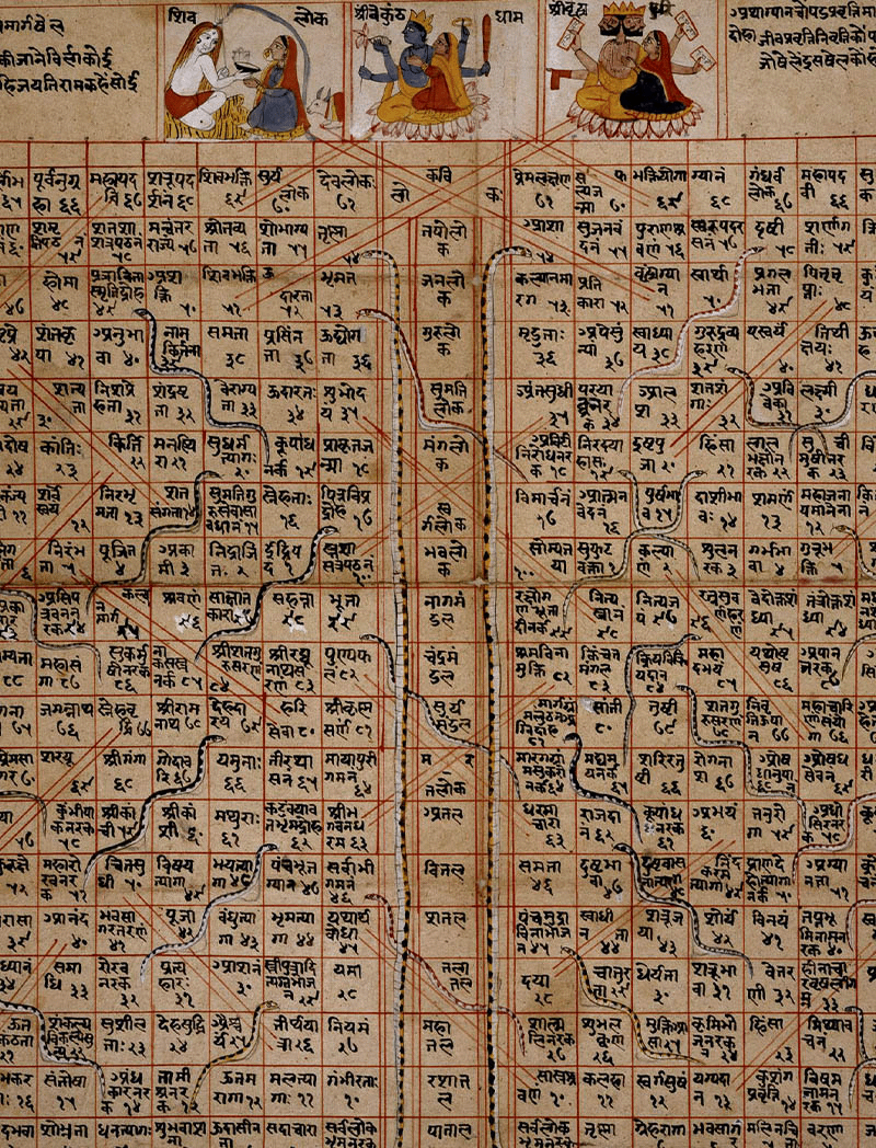 Game of Heaven and Hell (Jnana Bagi). Each square has not only a number but a legend which comprises the names of various virtues and vices. The longest ladder reaches from square 17 'Compassionate Love' to 69'.