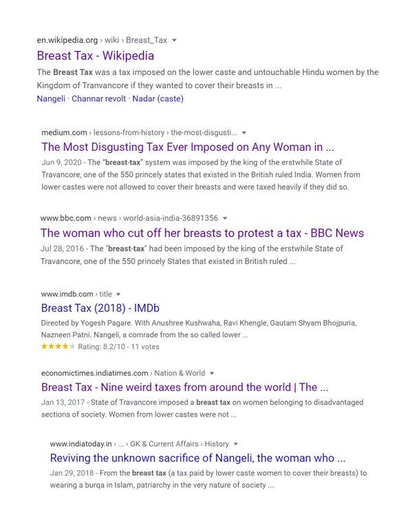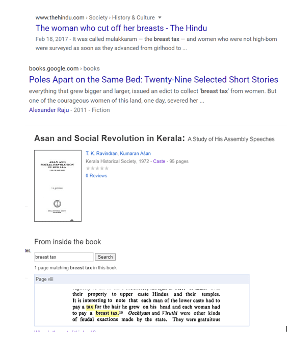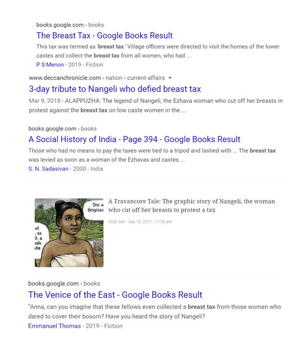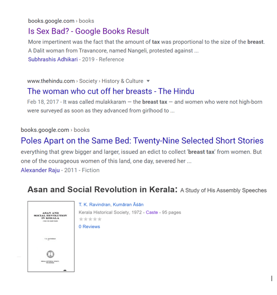Mentions of Breast-Tax in chronology 1972 Book by TKRavi. 1973 Book by TKRavi. 2000 Book by SN Sadesivan 2011 Book by A. Raju 2016 BBC 2017 Indiatimes,Scroll,theHindu 2018 Deccanchronical,Indiatoday.,Movie by Pagare 2019 books by Menon, Emmanuel T, Subhrashis, S pillai