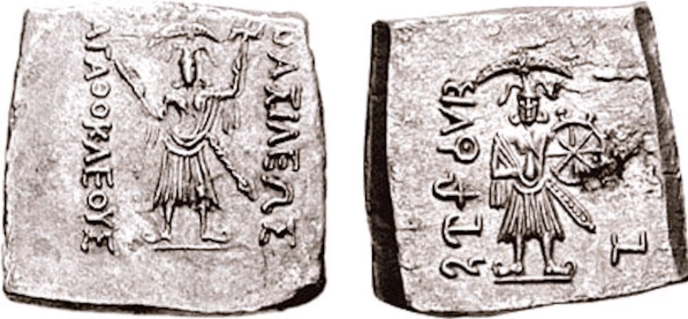 Pic1-The two deities Samkarshana and VÄsudeva on a coin of Agathocles of Bactria, c. 190-180 BCE.