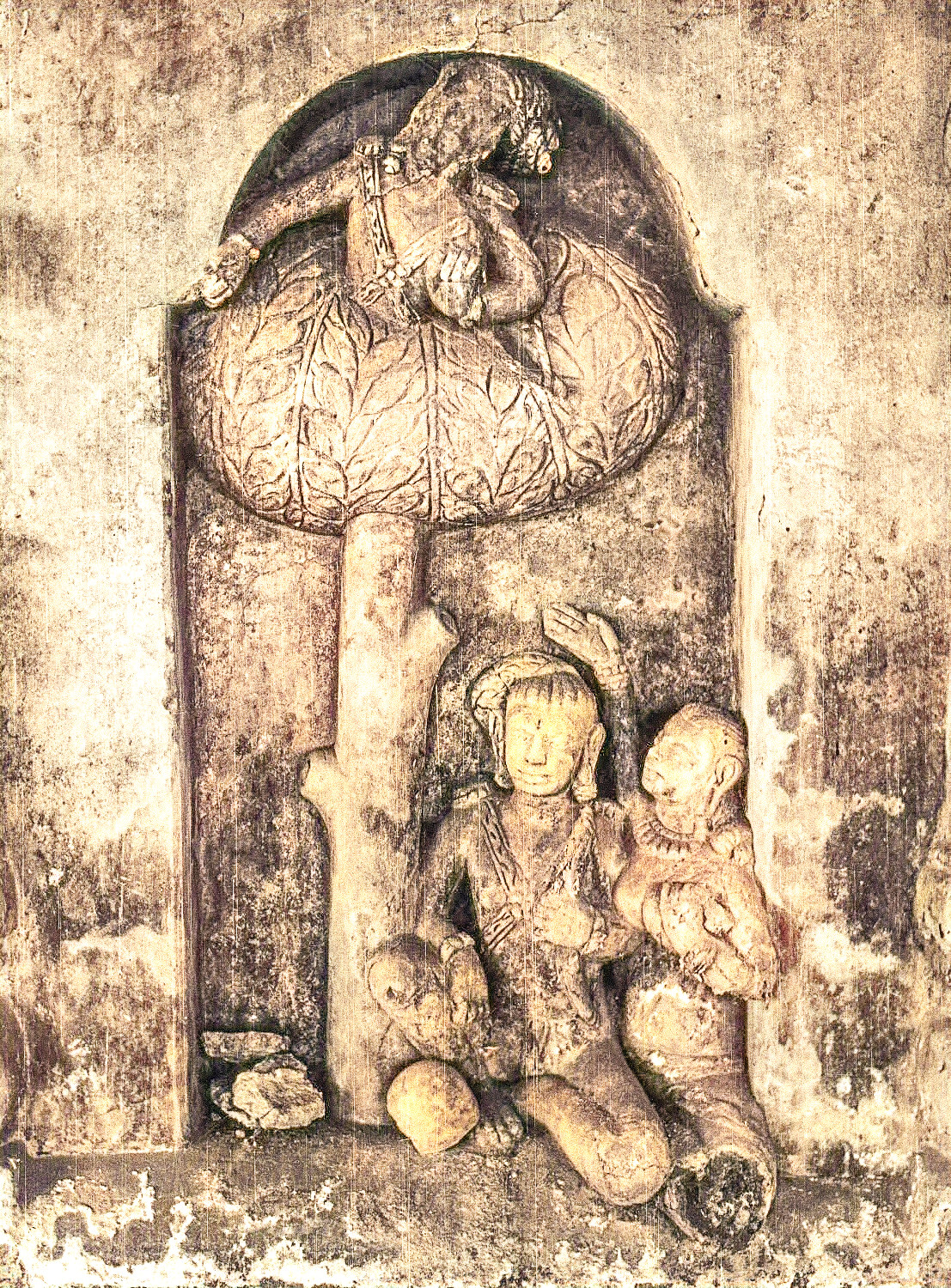Rama and Sita seated under a tree, Lakshmana watching from top of the tree Vishnu Temple Apsad, Nawada, Bihar ca. 600-699 ce