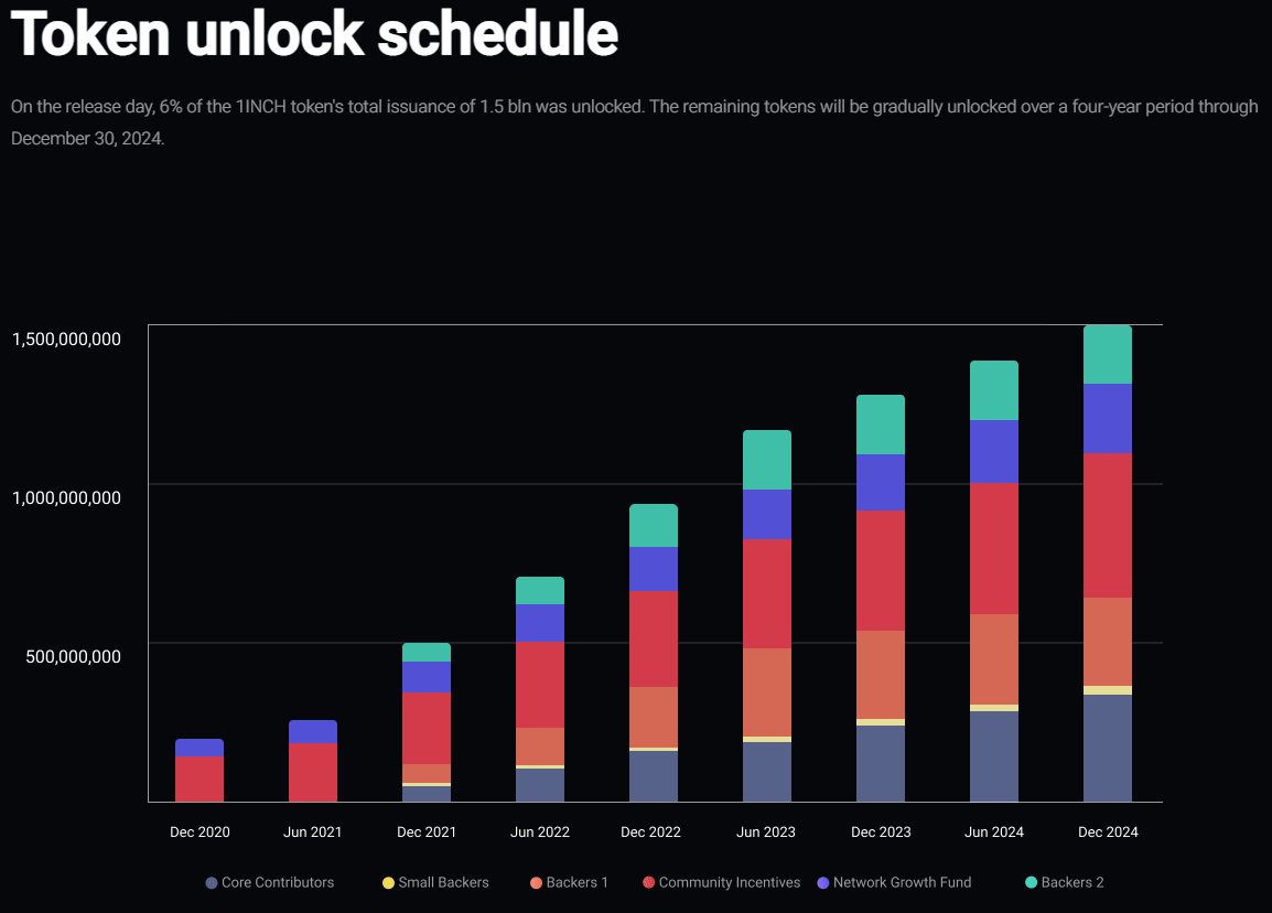 $1INCH est un token qui connaît et va encore connaître pas mal d'inflation de part sa jeunesse. Actuellement, seule 33% de la supply est en circulation, et elle doublera d'ici Décembre environ. Il faut le savoir, car cela entraîne une pression baissière sur le prix.