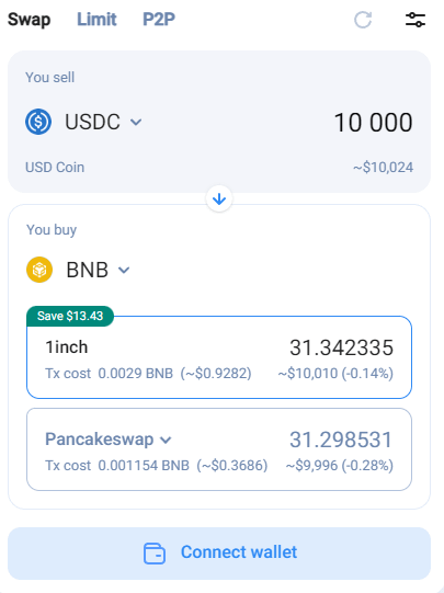 Par exemple, si je souhaite acheter pour $10K de $BNB en $USDC, passer par un agrégateur comme @1inch me permettra d'économiser environ $26 par rapport à @PancakeSwap. Un autre exemple avec un achat de $50K $ETH en $DAI,ou j'économise $84 par rapport à @Uniswap.
