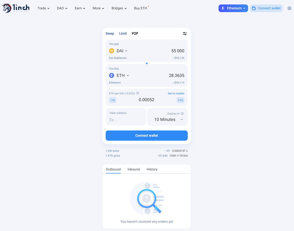 @1inch propose également de l'échange en P2P. Cela vous permet de faire des offres à un wallet spécifique à un prix spécifique. Le wallet en question a ensuite un certain délai pour accepter votre offre, délai évidemment configurable selon les besoins. Pratique pour l'OTC.