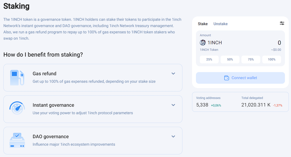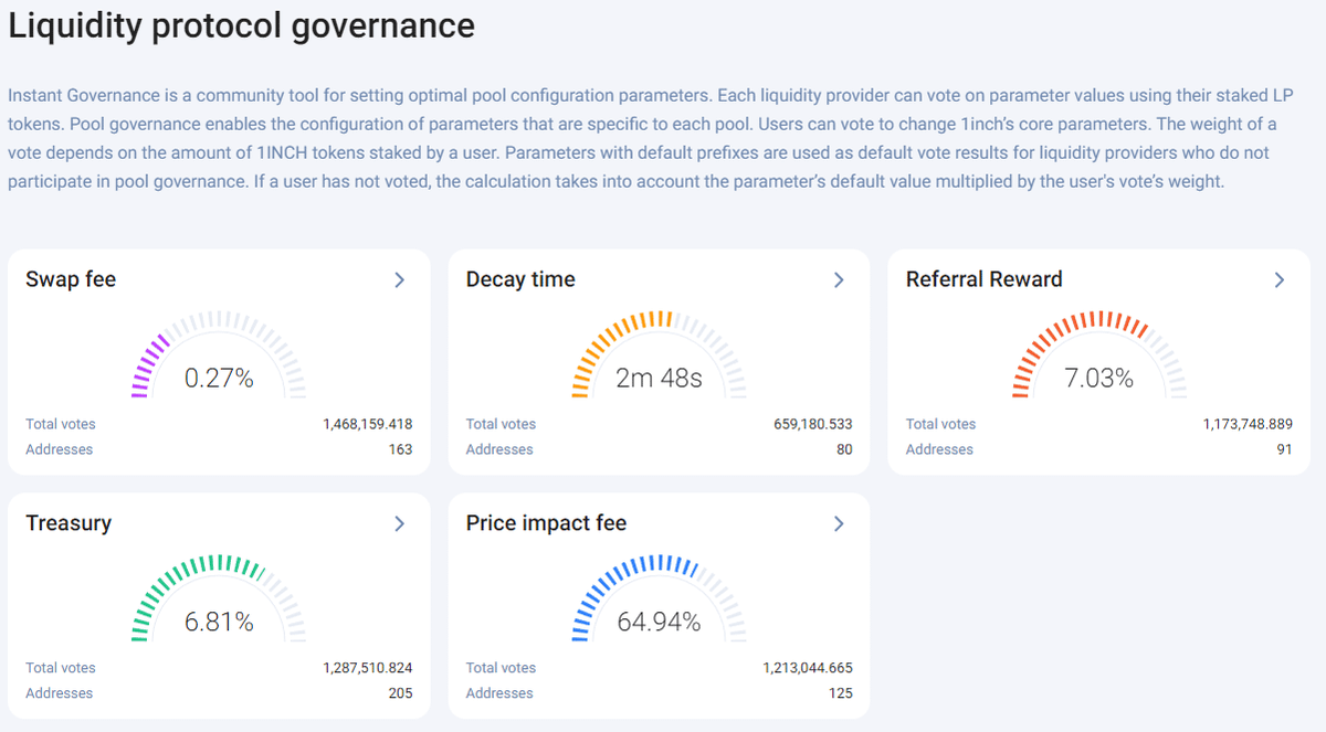 @1inch dispose enfin de sa propre DAO, depuis laquelle il est possible de participer à la gouvernance du projet. Différents types de votes sont possibles : ceux liés au paramétrage de la dApp (referrals et liquidité), et ceux liés aux évolutions.
