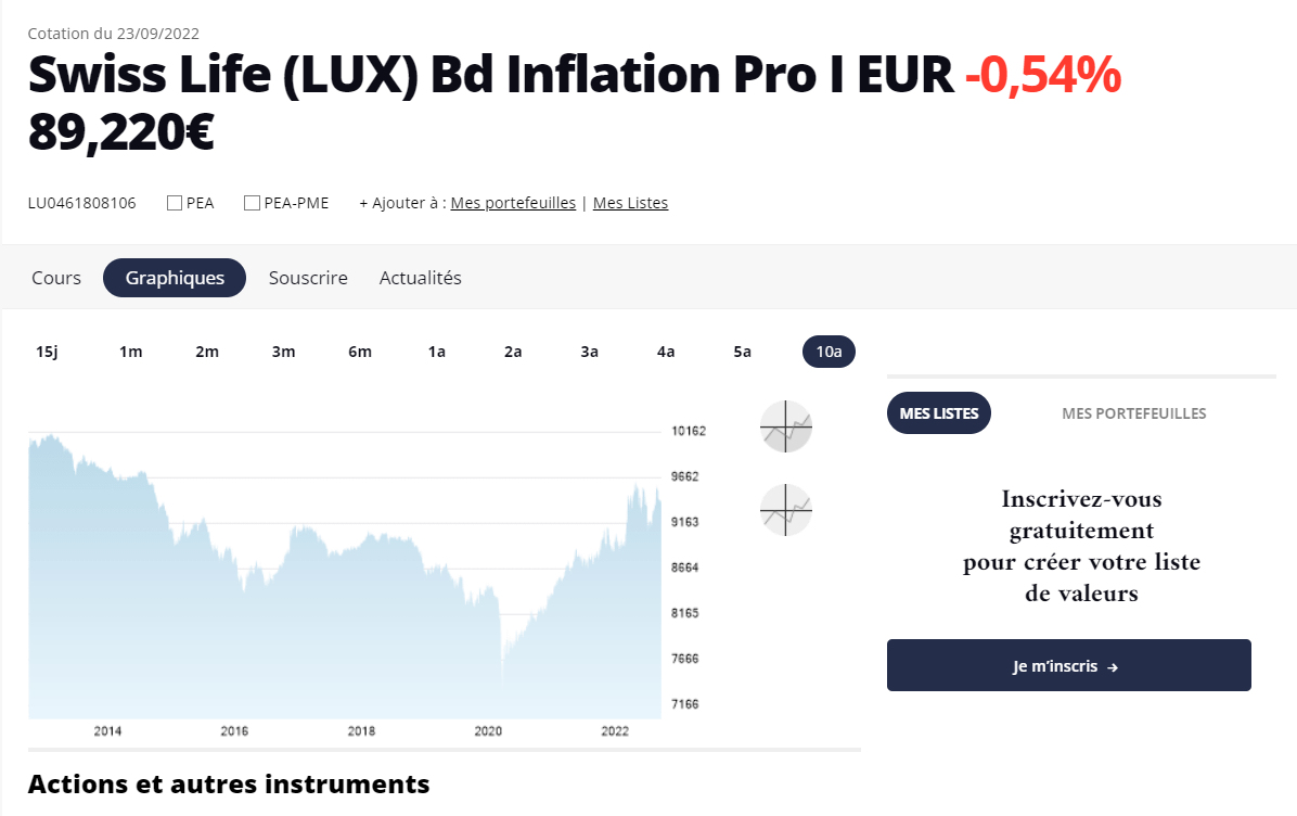 Vous pouvez vous tourner vers des ETFs comme $VTIP ou $IUS5, et des SICAV comme Swiss Life Bd Inflation Pro si ce type d'instrument correspond à votre tolérance aux risques et objectifs de rendement.