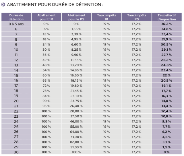 Les PV sont taxées comme les PV immobiliÚres, soit à 19% + 17,2% de PS. Abattement progressif à partir de la 6e année de détention, pour arriver à une exonération totale au bout de 22 ans de détention.