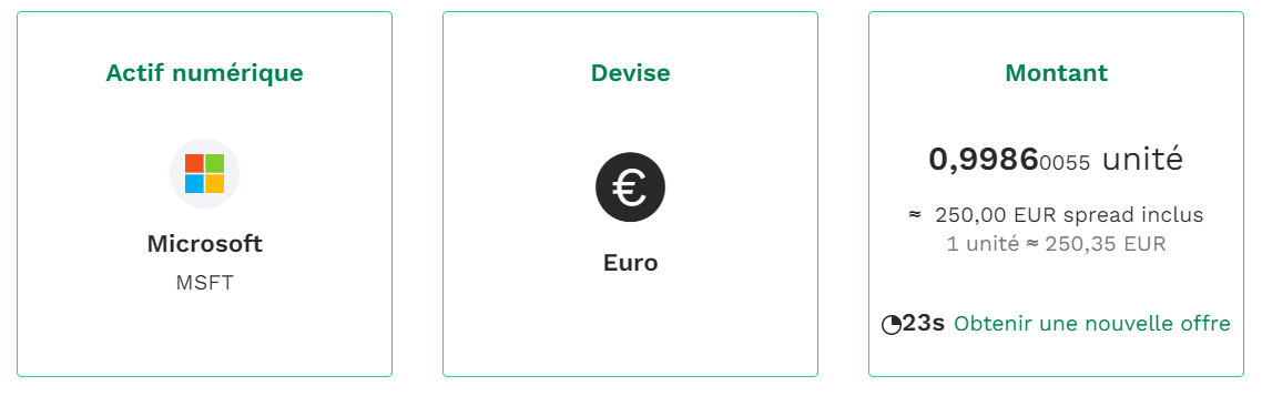 Idem pour les placements en bourse, certaines plateformes vont vous facturer plus que d'autres. Pour vos achats à l'étranger, BitPanda est idéal puisque vous ne payez que le spread. Par exemple, sur Microsoft, je vais avoir 0,11€ de frais (environ 0,044%).