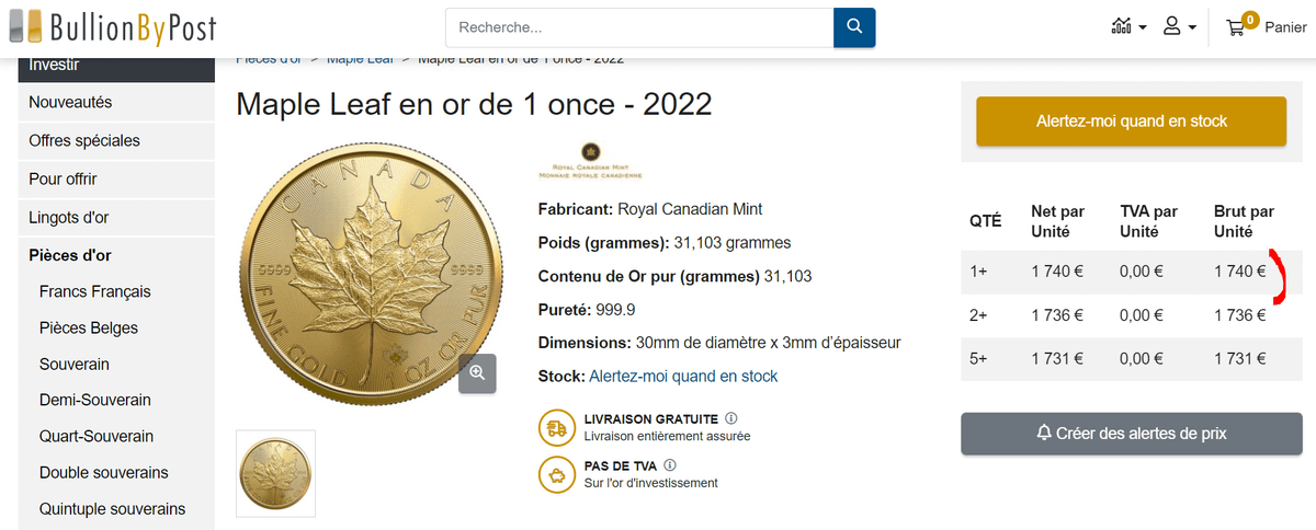 Concernant l'or, c'est le premium (la commission en gros) des pièces qui va jouer. Là encore, comparer peut vous épargner de nombreuses dépenses inutiles. Ainsi, entre trois sites, vous pourrez économiser jusqu'à 40€ par once. Achetez-en 10, ça fait 400€ de différence.