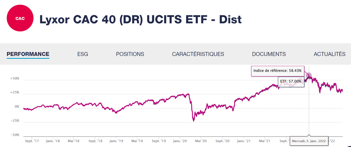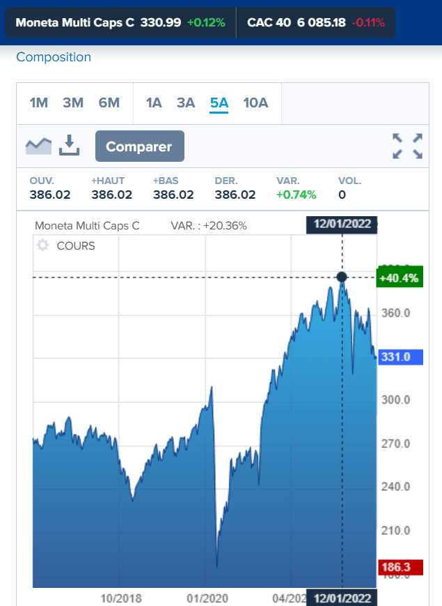 Résultat ? Moneta Multi Caps est à +40% en 5 ans au plus haut quand Lyxor CAC 40 est à +57%, et ce à cause des frais. Sur une somme de 10K€, vous passez de 5700€ de PV à 4000€ en prenant un OPCVM, soit un manque à gagner de 1700€ que vous avez payé en frais...