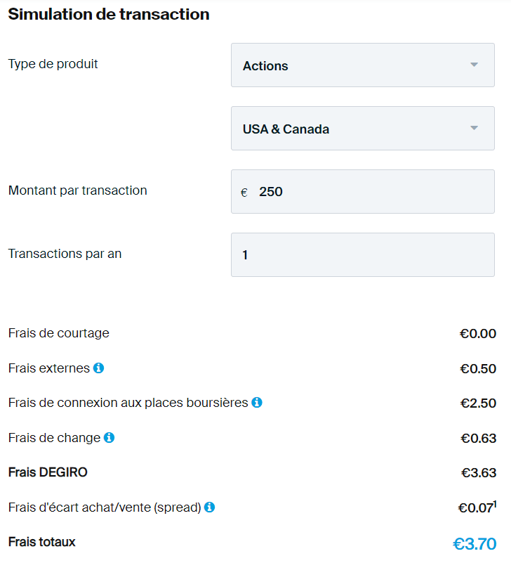 Du côté de Degiro, ça se corse, puisqu'en plus du spread (quasiment identique à Bitpanda), vous allez devoir payer diverses prestations. Ainsi, sur le même montant, je vais cette fois-ci payer 3,7€ de frais, soit une différence de +3000% par rapport à BitPanda.