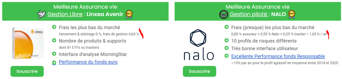Concernant les assurances-vie, même logique, même s'il y a plus de subtilités. Nous avons vu qu'il y avait des frais liés au type de contrat, mais il y a également des frais liés aux produits que vous mettez dedans !