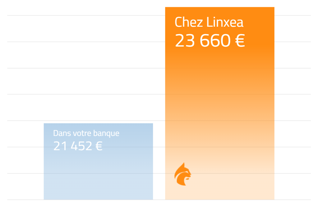 Là encore, faites vos calculs et comparez : 10K€ placés sur une assurance-vie comme Linxea à 0,6% de frais et à 4% de rendement annuel vous rapportera 23,6K€ au bout de 20 ans, contre 21,5K€ dans une banque traditionnelle, soit une économie de 2,1K€.