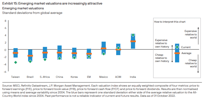 👉 Les marchés émergents sont sous-évalués par rapport à leur moyenne, investir sur un ETF type MSCI Emerging Markets Index semble intéressant