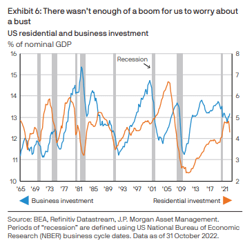 👉 La récession devrait être modeste, peu de croissance excessive sur les investissements business (vs 2000) et immobilier (vs 2008)