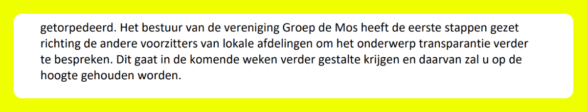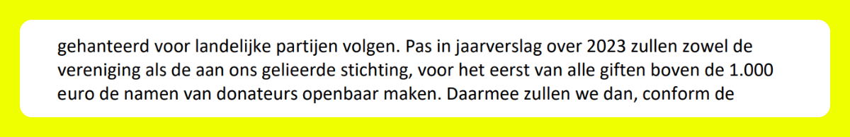 Een van de toezeggingen was het vanaf dit jaar ( 2024) publiceren van alle donateurs die meer dan 1000,- bijdroegen. De andere was het voeren van gesprekken over partijfinanciering en transparantie.