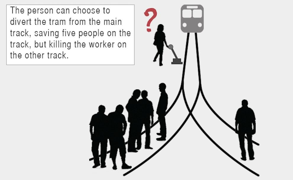 eg, the trolley problem, which explores the ethics of sacrificing 1 life to save lives of many, In this scenario, a trolley is heading towards a group of people on a track, the only way to save them is to divert the trolley onto another track where only 1 person is standing.