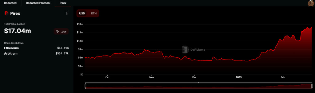 2023 lượng TVL của Pirex đã tăng vọt từ mức khoảng $5M lên mức hiện tại là $17M tương đương với hơn 200%.