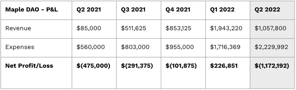 Tình hình kinh doanh thực tế của Maple Finance từ Q2/2021 đến Q2/2022: