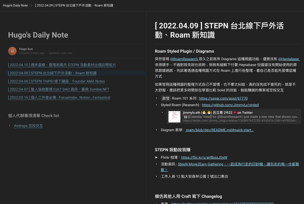 Roam 則是太多破碎的想法紀錄,有些又是個人淺薄的思考 不太想被檢驗跟評價;如果 Roam 共享出來就幾乎沒隱私了,真的太多事我都會紀錄在上面