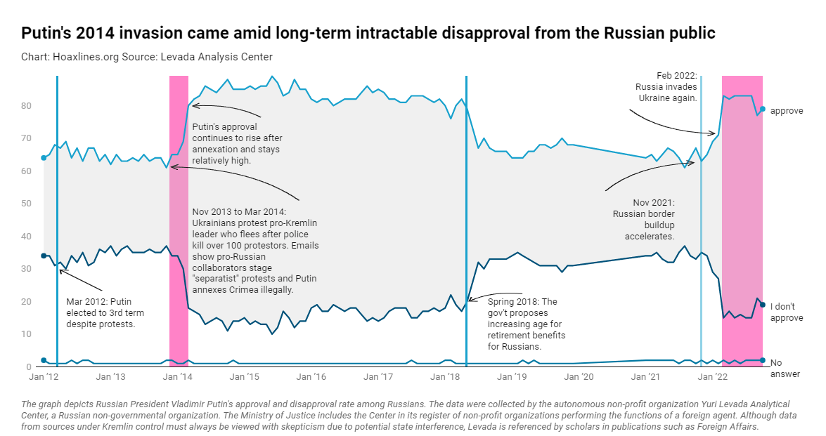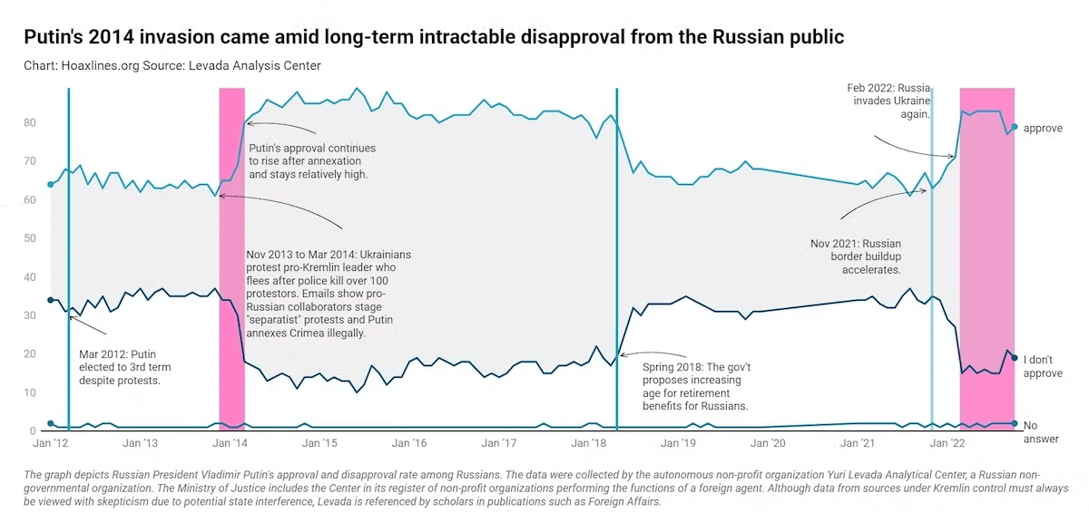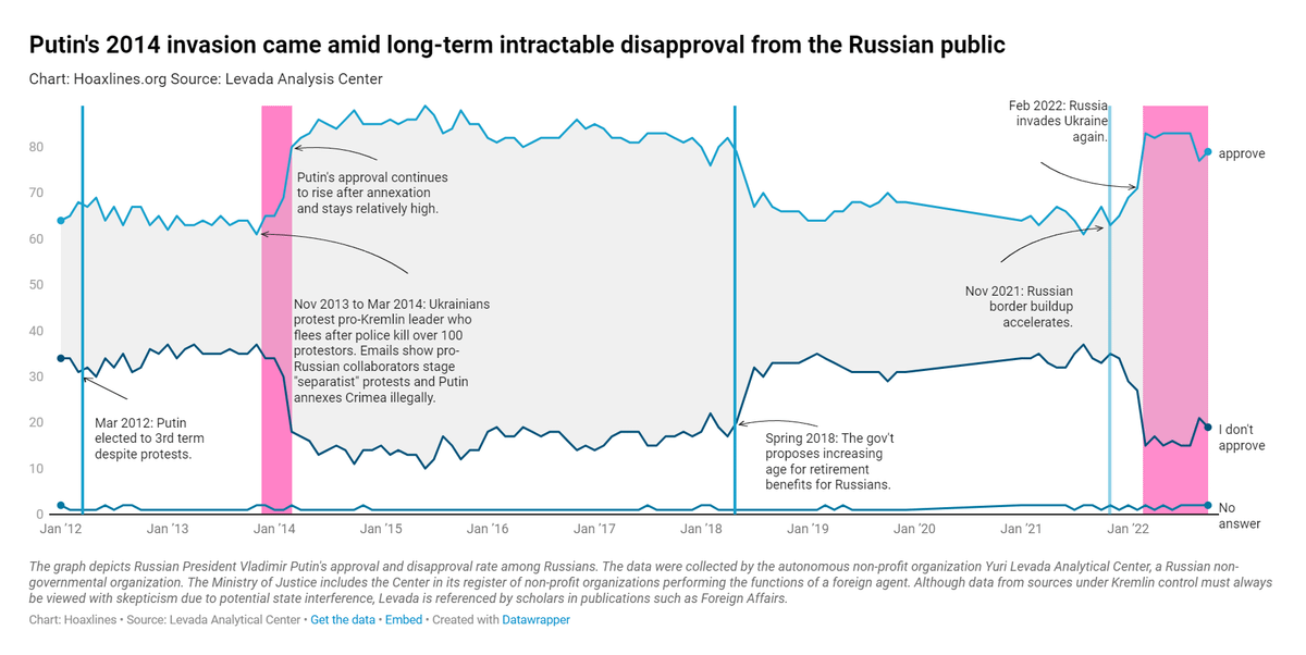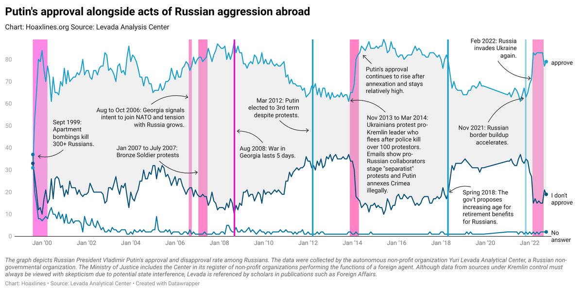 Hoaxlines data analysis of Putin's approval rating alongside Russian aggression abroad affirms what other research has found. Putin's aggression abroad often reduces disapproval ratings and boosts approval ratings. hoaxlines.org/putins-approval-and-aggression-abroad