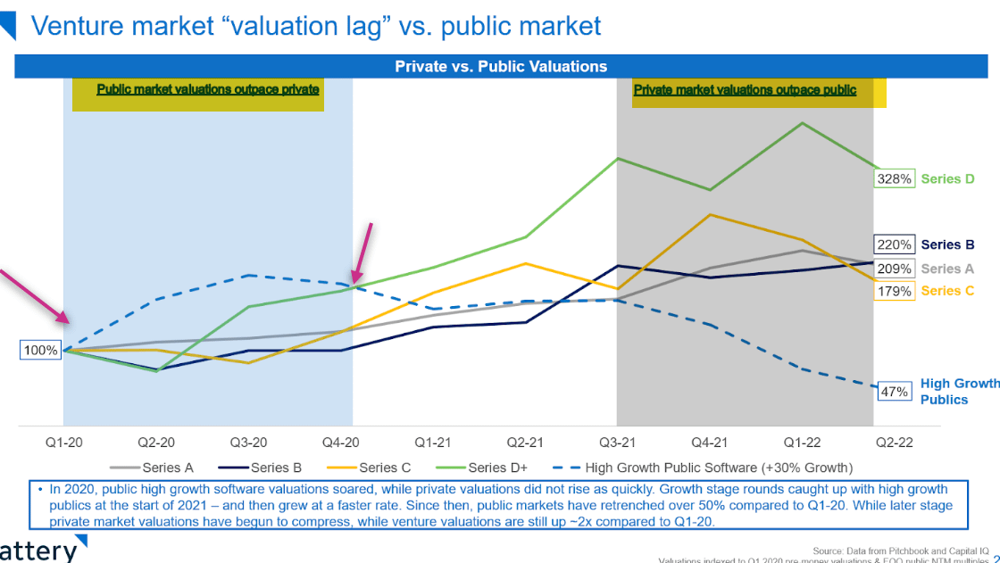 I added some annotations to show how in 2020 valuations for public growth cos grew faster... until venture capital got caught up in FOMO in 2021.