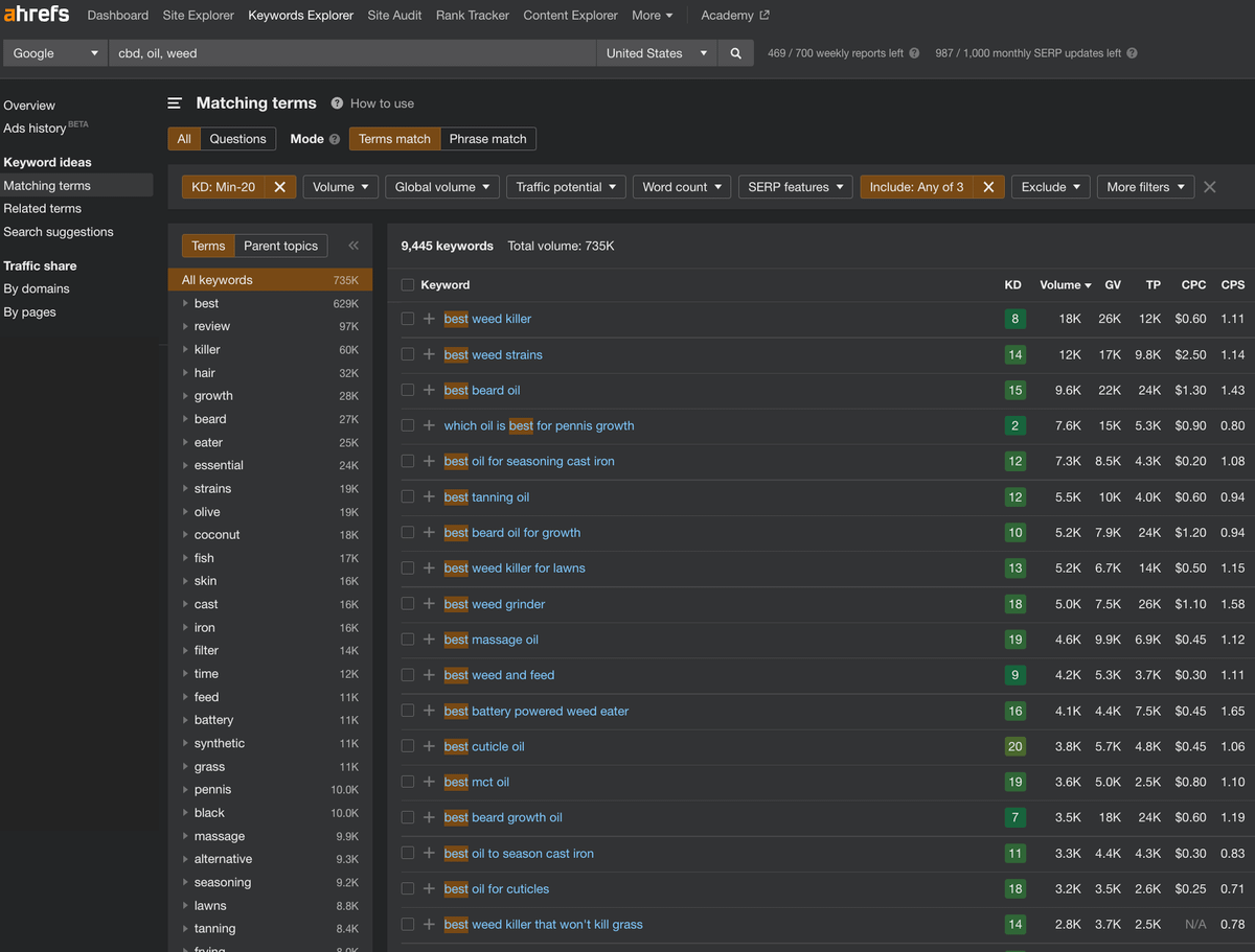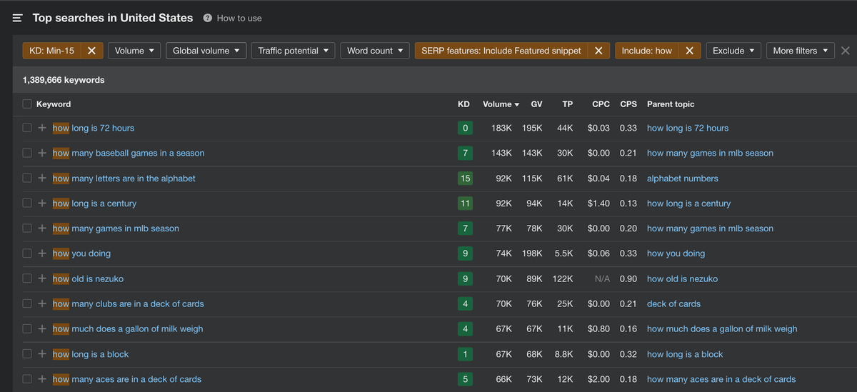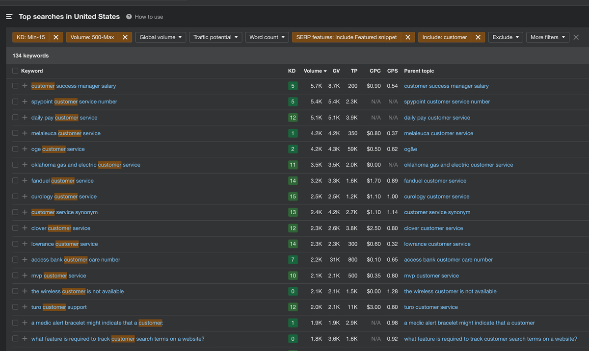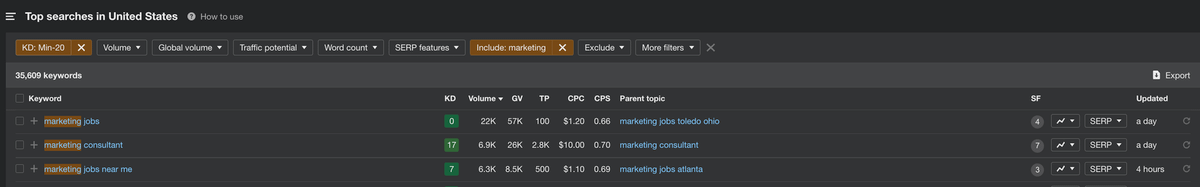 3. Early on in your SEO journey? Use #1. hack and filter KD <15; vol. >500; enter core kw.