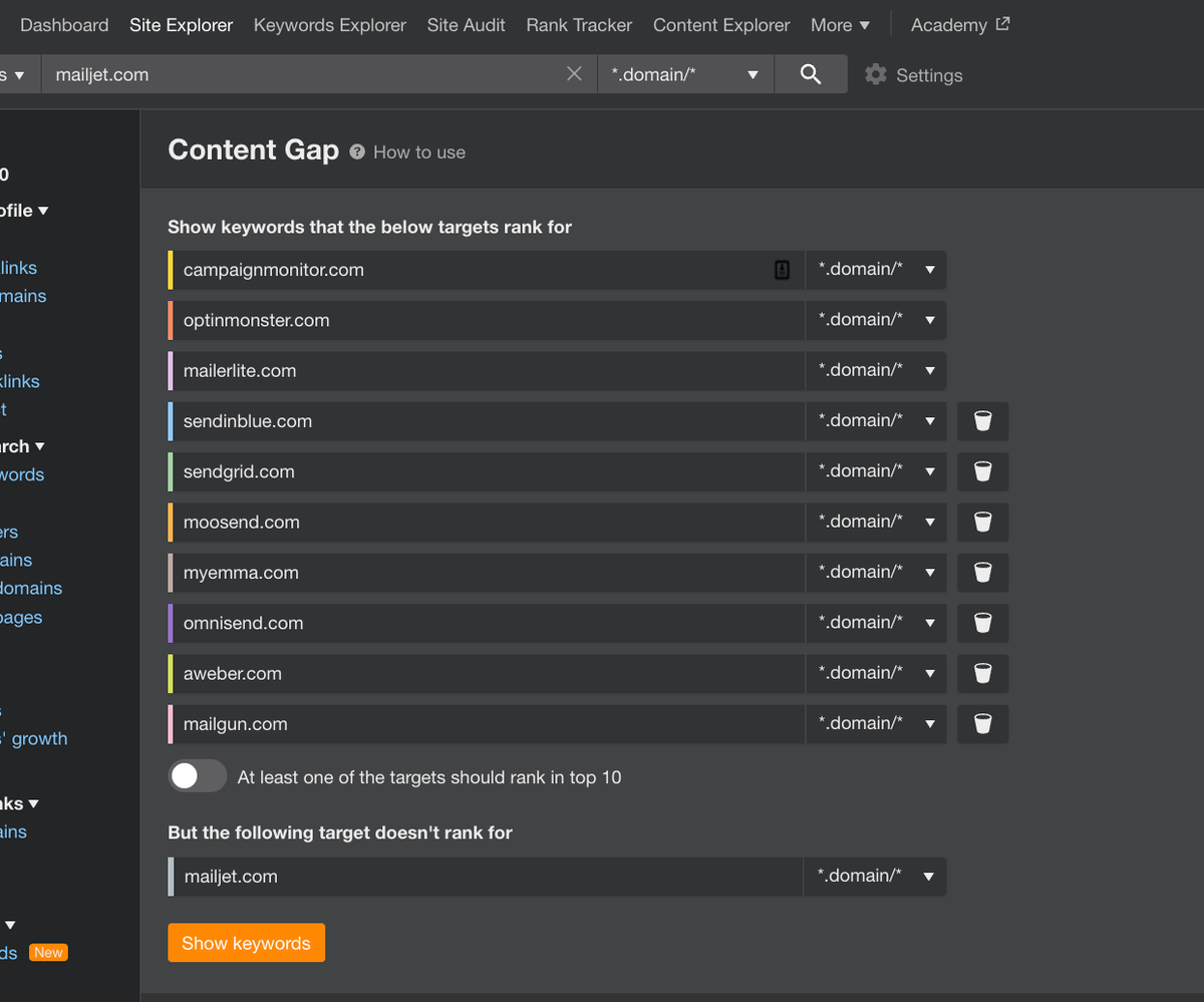 Enter URL > Competing Domains > Content gap - Enter top 10 competitors > Use Filter tool