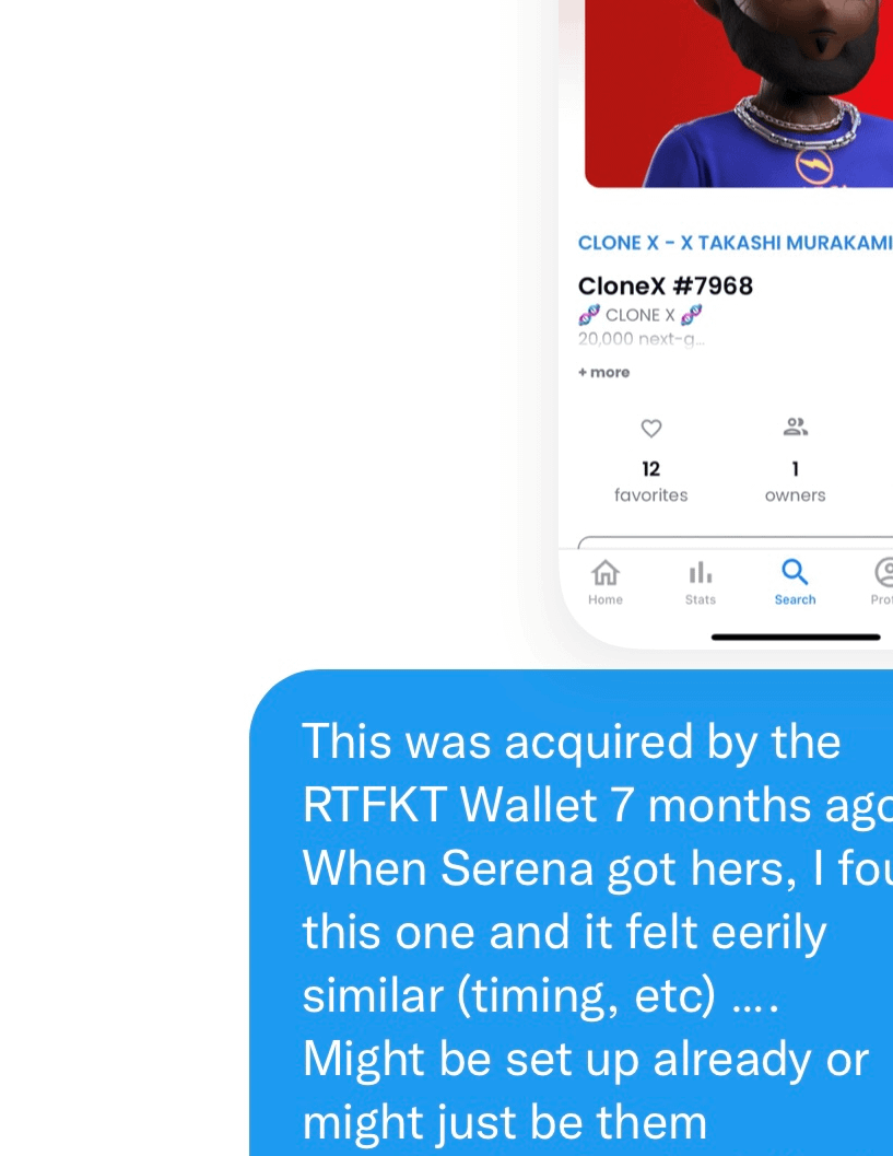5/8 To be clear this is NOT an RTFKT specific event and no one other than Lebron has any real ties to RTFKT so there's no evidence at all to jump to conclusions about any other athletes or Nike celebs yet. Also, there is only one other clone in the RTFKT wallet (blue pigtails).