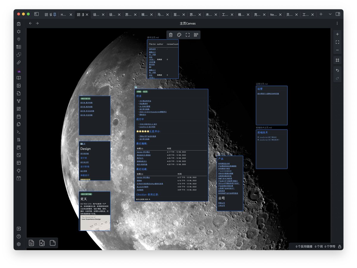 上面的介绍还不够直观 这次的更新,可以让你的笔记速度更快,更上瘾 这次录制的视频里,简单尝试了一下把设计史相关的笔记平铺在 Canvas 上 相比网络图谱而言这个功能要更加有用,更加直观 Obsidian 无限可能