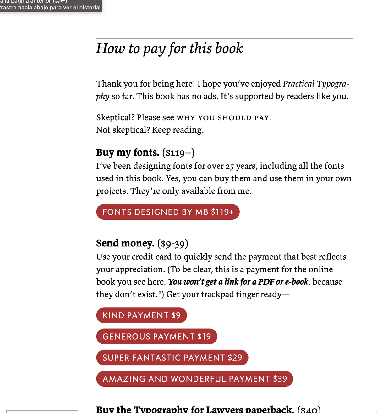 En «Practical Typography» el autor apela directamente al lector para que contribuya a sostener económicamente el esfuerzo creativo. Propone una donación económica, y en la obra visibiliza unas tipografías por él también creadas, que están a la venta.