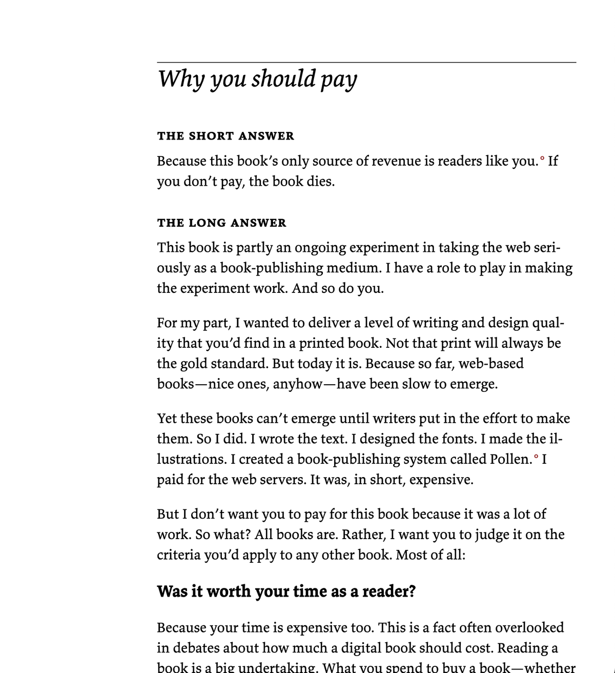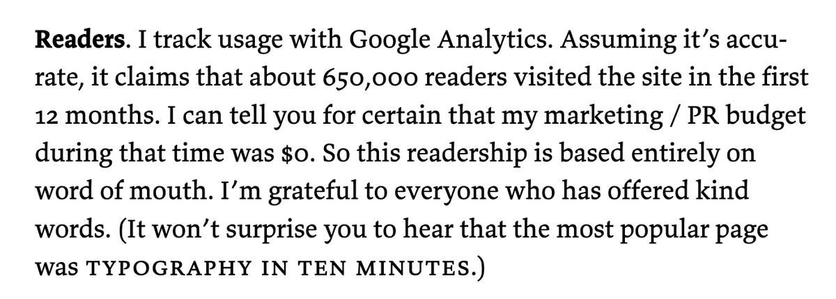 Y, además, hace un interesante ejercicio de transparencia compartiendo las cifras del retorno económico de la obra. Que en el caso de «Practical Typography» son, en resumen, estas: uno de cada 650 lectores ha pagado por el libro. El resto, parece que no.