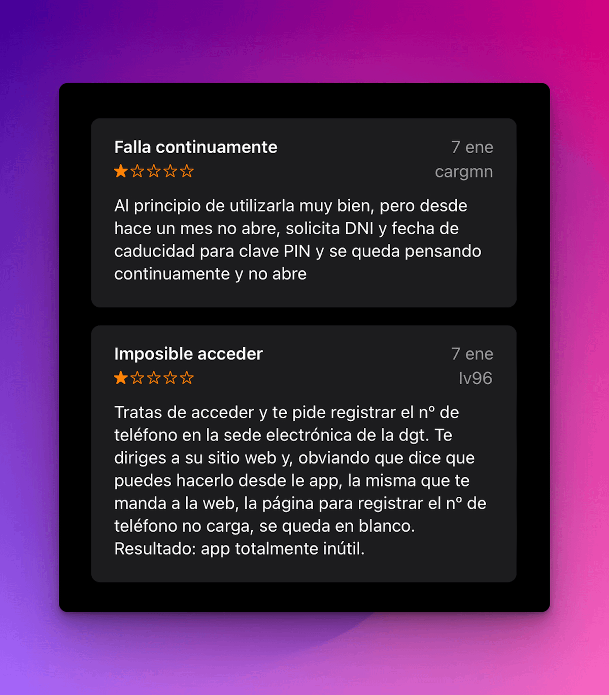 Llegados a este punto, desinstalo frustrado miDGT de mi teléfono, pues es inusable para mí. No soy el único: miles de conductores llevan avisándoles desde hace dos años de que su aplicación es «una chapuza», «no funciona» o «no se abre».