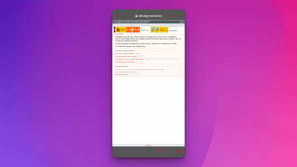 Imposibles las dos opciones anteriores, solo me queda «Clave Permanente». Esto inicia una retahíla de redirecciones que culmina pidiéndome que me registre en un sistema —ahora de la Seguridad Social—, que tiene esta terrible pinta en mi teléfono.