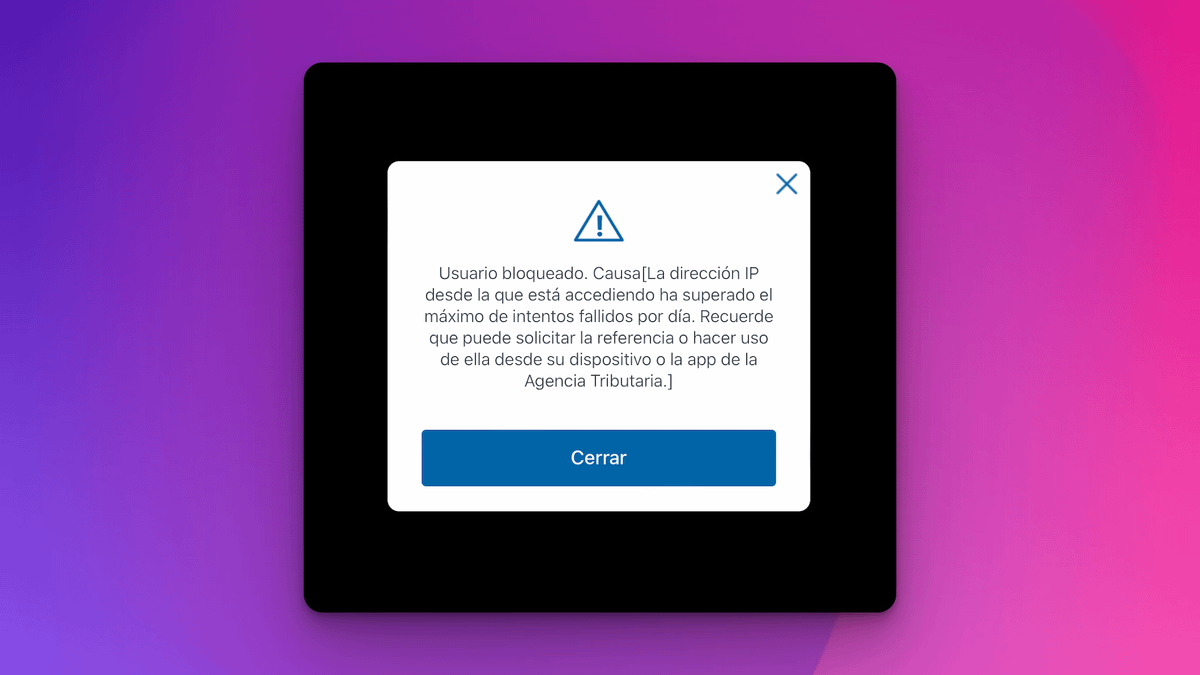 «Usuario bloqueado. La dirección IP desde la que está accediendo ha superado el máximo de intentos fallidos por día. Recuerde que puede solicitar la referencia o hacer uso de ella desde su dispositivo o la app de la AEAT».