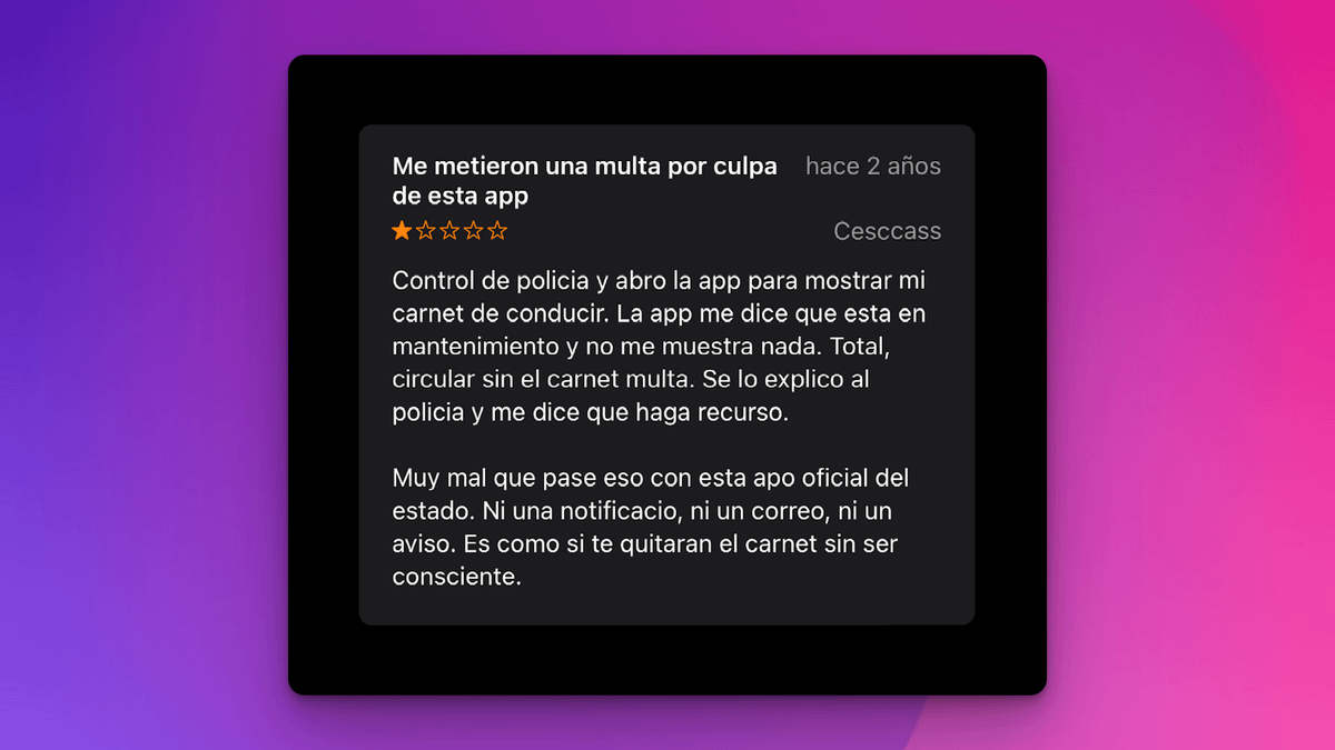 Ustedes anuncian la documentación digital como igual de válida que la de papel. Pero la digital no es confiable. Lean esta reseña, por favor. Es de hace dos años, y sigue vigente porque podría sucederle hoy a cualquiera que confíe en «miDGT» como reemplazo del carné tradicional: