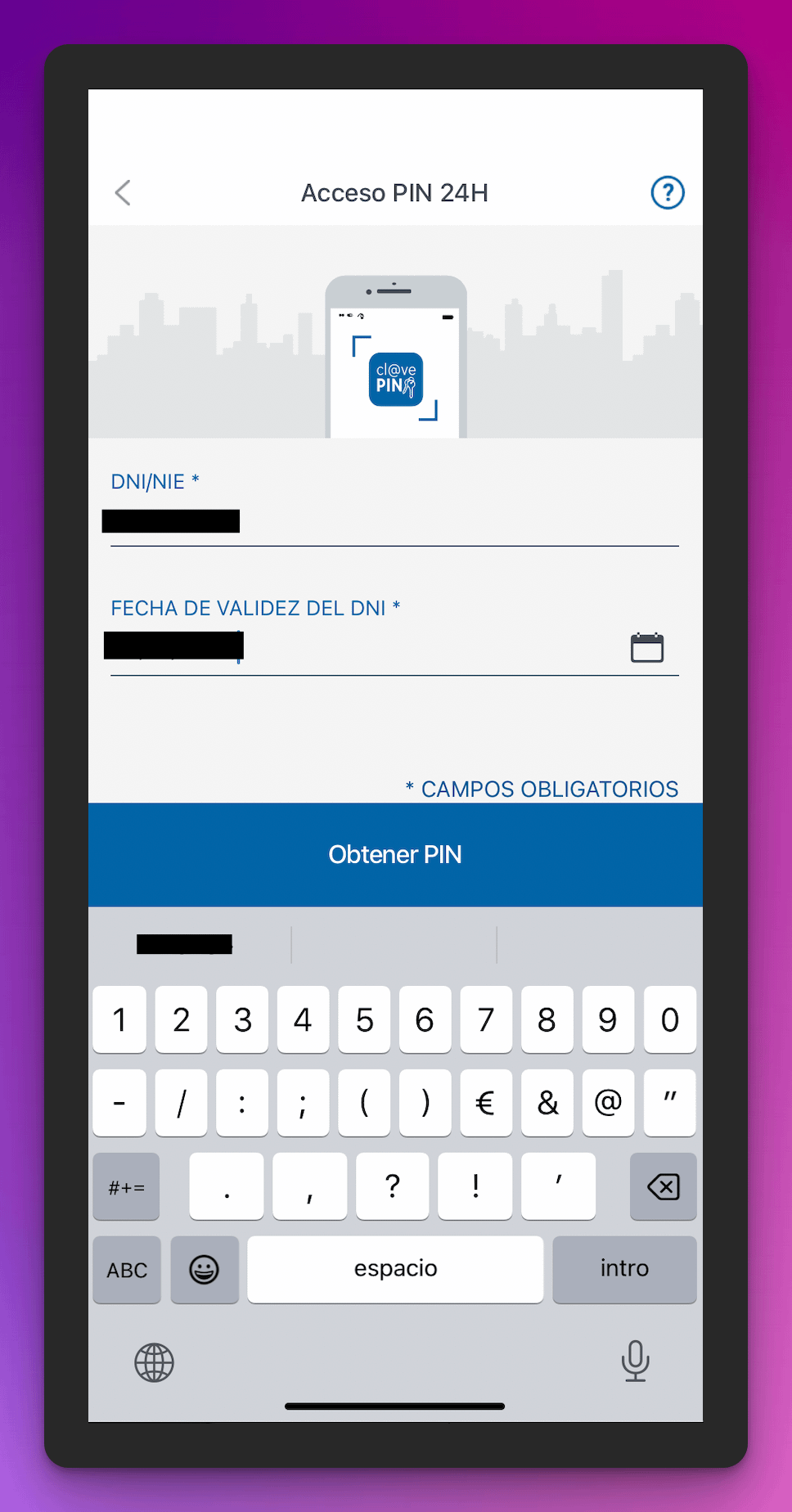 Al seleccionar la opción, me pide mi DNI y su fecha de validez. Los introduzco y pulso «Obtener PIN».