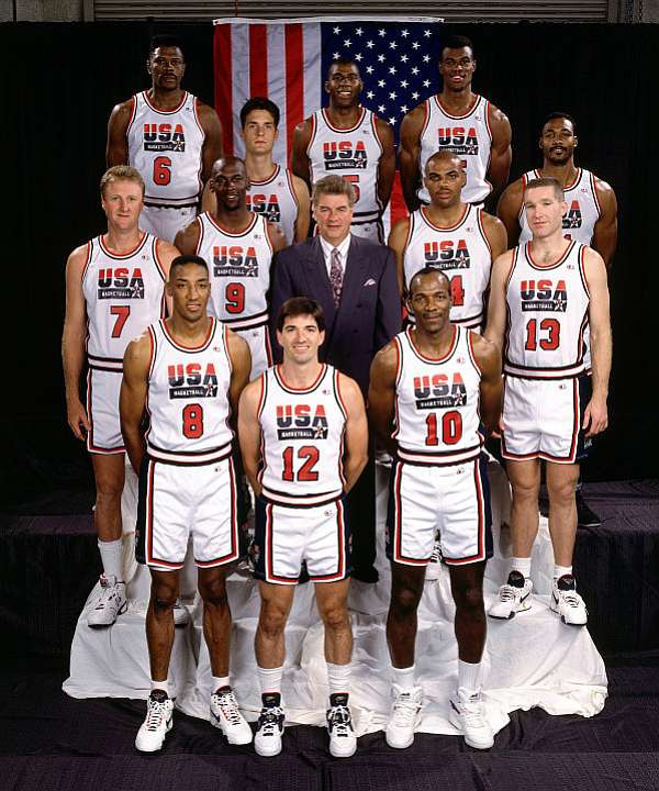 Del otro: Magic, Stockton, Barkley, Mullin, Robinson y Laettner.